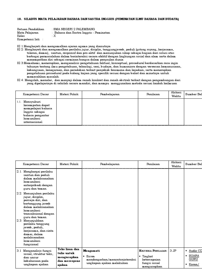 Silabus bahasa inggris peminatan smamasmk kurikulum 2013 revisi kkm bahasa dan sastra inggris kelas x kurikulum belajar.