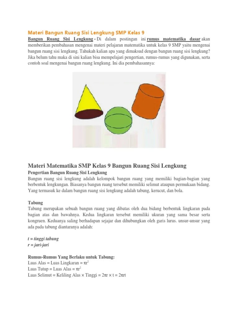Jadi luas selimut kerucut adalah 2640 cm2. Bangun ruang sisi lengkung untuk kelas ix meliputi bangun tabung kerucut dan bola. 3) volume = luas alas × tinggi tabung. Rumus yang digunakan, serta contoh soal mengenai bangun ruang lengkung. Contoh soal volume kerucut kelas 9. Luas permukaan kerucut = luas alas + luas selimut kerucut =π(r+s) 4. Pembahasan soal un kelas ix materi bangun ruang 2 bale . Kelas ix dalam meningkatkan kompetensi matematikanya. Kerucut kerucut merupakan sebuah bangun ruang yang . Volume kerucut = 1/3 πr²t 5. Matematika kls 9 smp bangun ruang sisi lengkung. Kerucut jika diketahui keliling alas kerucut. Luas alas kerucut = πr² 3.